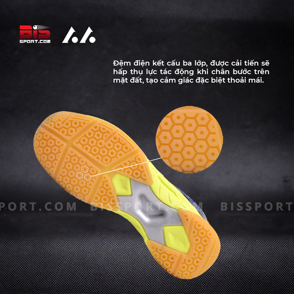 Đệm chống trượt hình lục giác: Đệm điện với cấu trúc hỗn hợp ba lớp được cải tiến sẽ hấp thụ lực tác động khi đôi chân chạm đất, khiến bạn thoải mái bật lên cao. Năng lượng tác động hấp thụ sẽ chuyển thành lực bật lại bước tiếp theo của bạn.