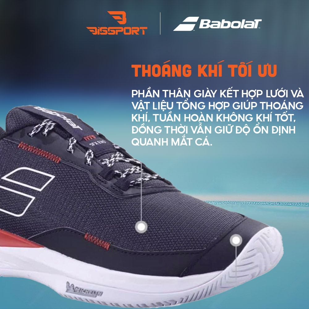 Babolat tối ưu cấu trúc thân đế để giữ sự cân bằng trong mọi chuyển động ngang. Khi bạn xoay người đón bóng hay lao nhanh về phía trước, đôi giày vẫn duy trì cảm giác chắc chắn, không lật cổ chân, không chòng chành.