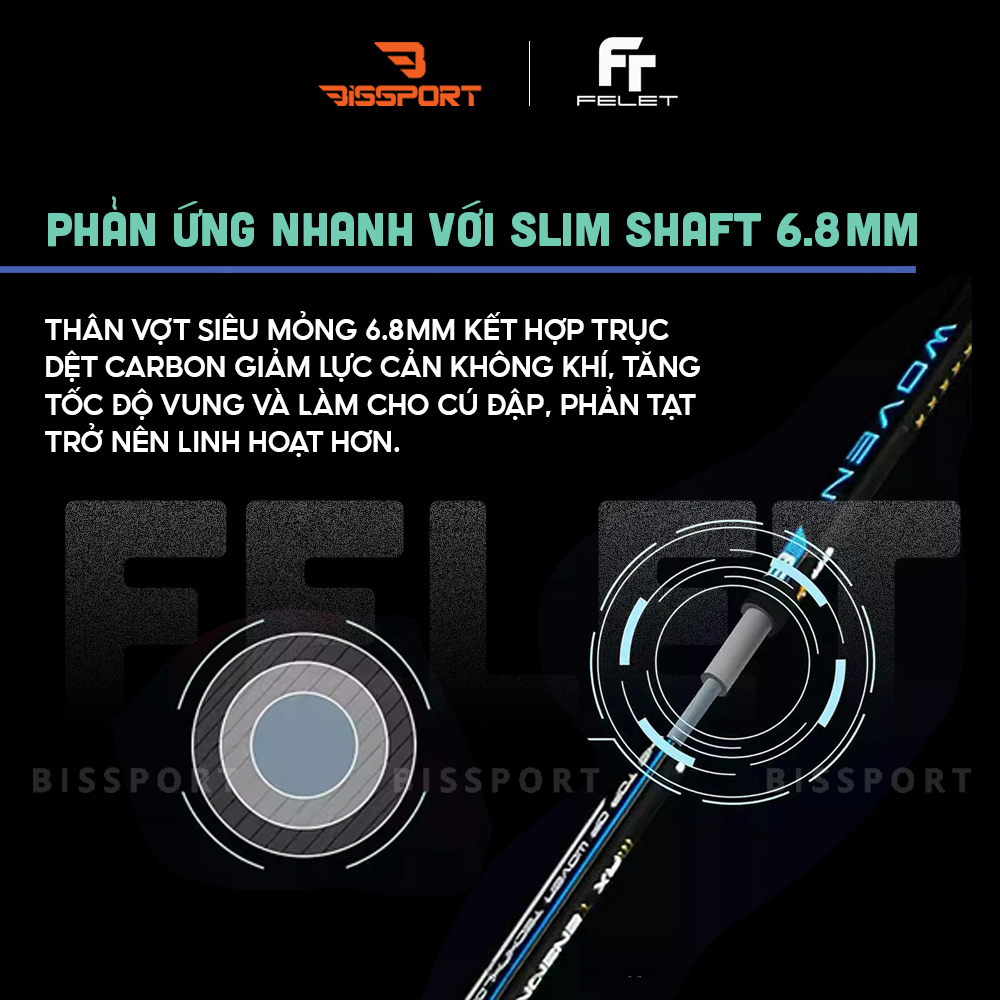 Điểm mạnh nhất của Felet Woven 8000 nằm ở khung vợt sử dụng carbon dệt. Khi đánh thực tế, cảm giác cầu rất rõ: cầu chạm mặt dây gọn, ít rung ngược về tay, đặc biệt trong các pha cầu nhanh hoặc phòng thủ.